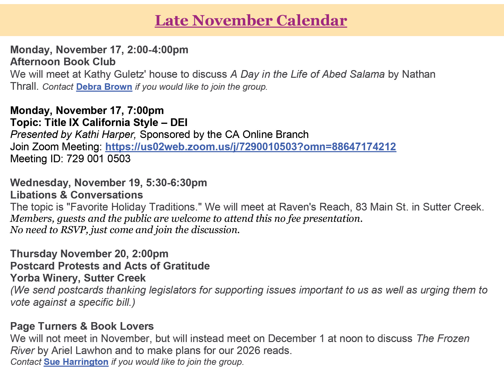 Maybe you will learn about one you would like to add to your own celebrations. What are your favorite family recipes? Bring copies of the recipe or bites to taste! Do you create themes for your holiday gatherings? Are there special activities you participate in to celebrate? Bring pictures and share how you celebrate. No need to RSVP, just show up. For more information: aauwamador@gmail.com