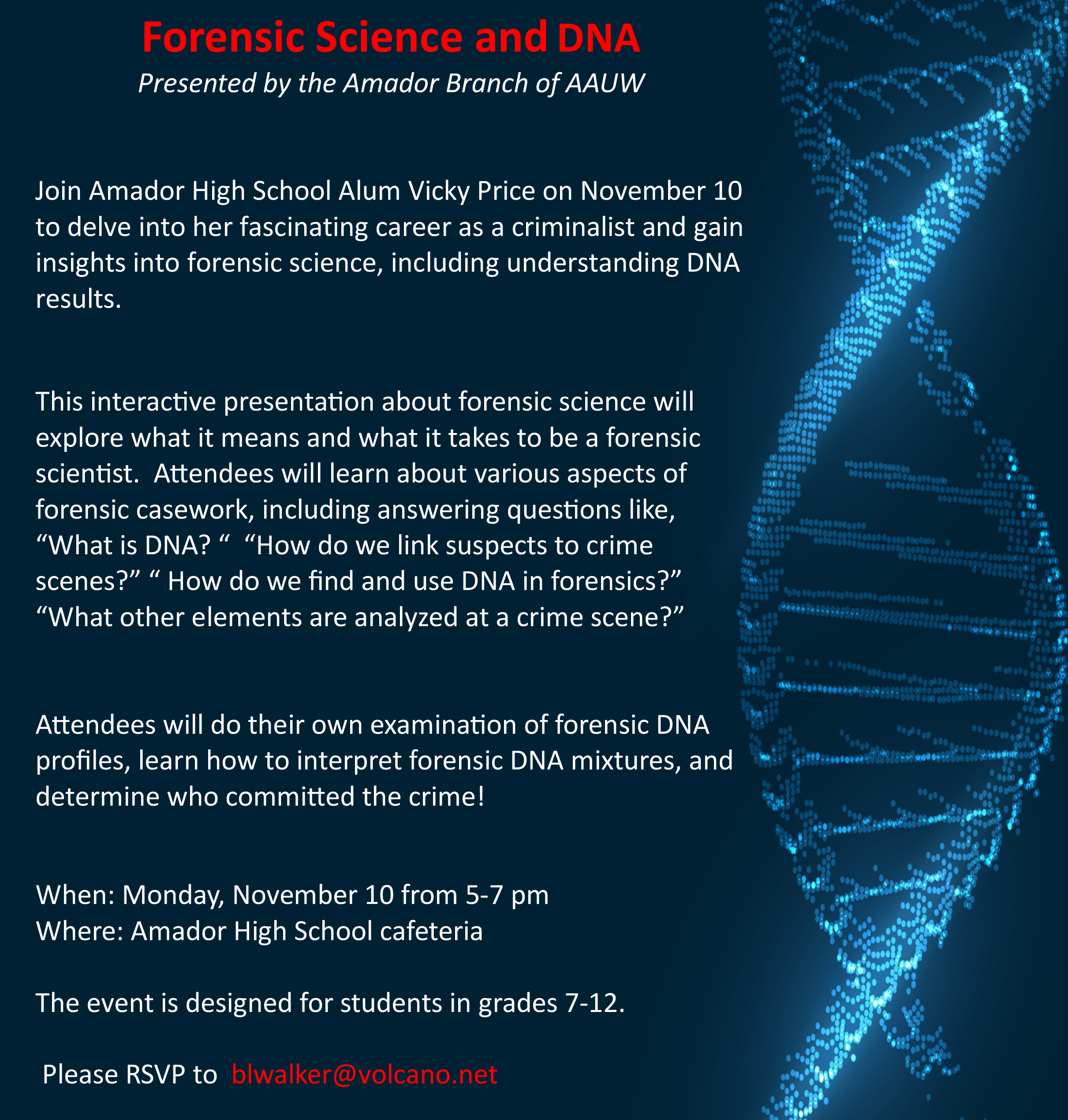 Join Amador High School Alum Vicky Price delve into her fascinating career as a criminalist and gain insights into forensic science, including understanding DNA results. This free interactive presentation about forensic science will explore what it means and what it takes to be a forensic scientist: