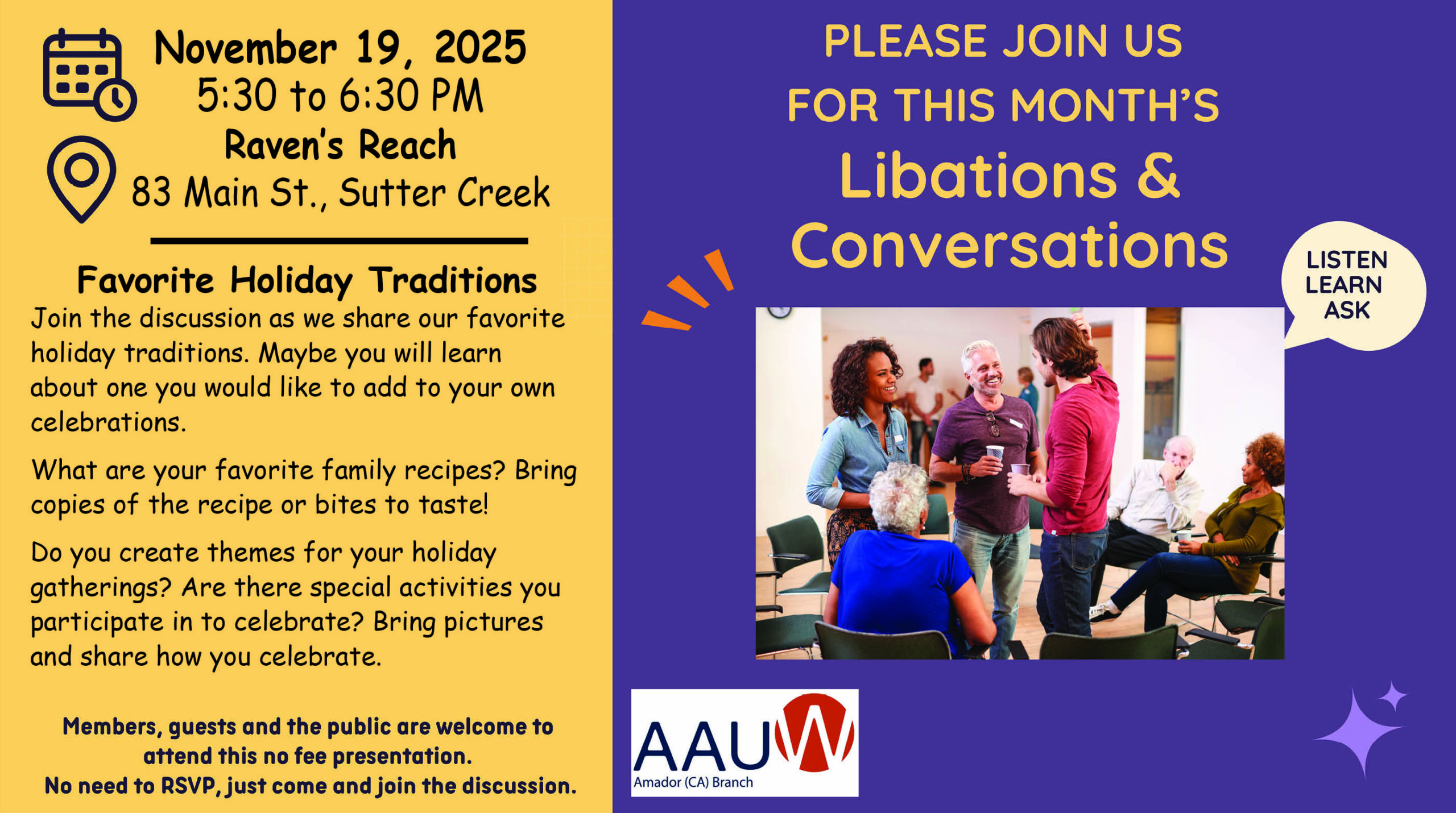 Maybe you will learn about one you would like to add to your own celebrations. What are your favorite family recipes? Bring copies of the recipe or bites to taste! Do you create themes for your holiday gatherings? Are there special activities you participate in to celebrate? Bring pictures and share how you celebrate. No need to RSVP, just show up. For more information: aauwamador@gmail.com