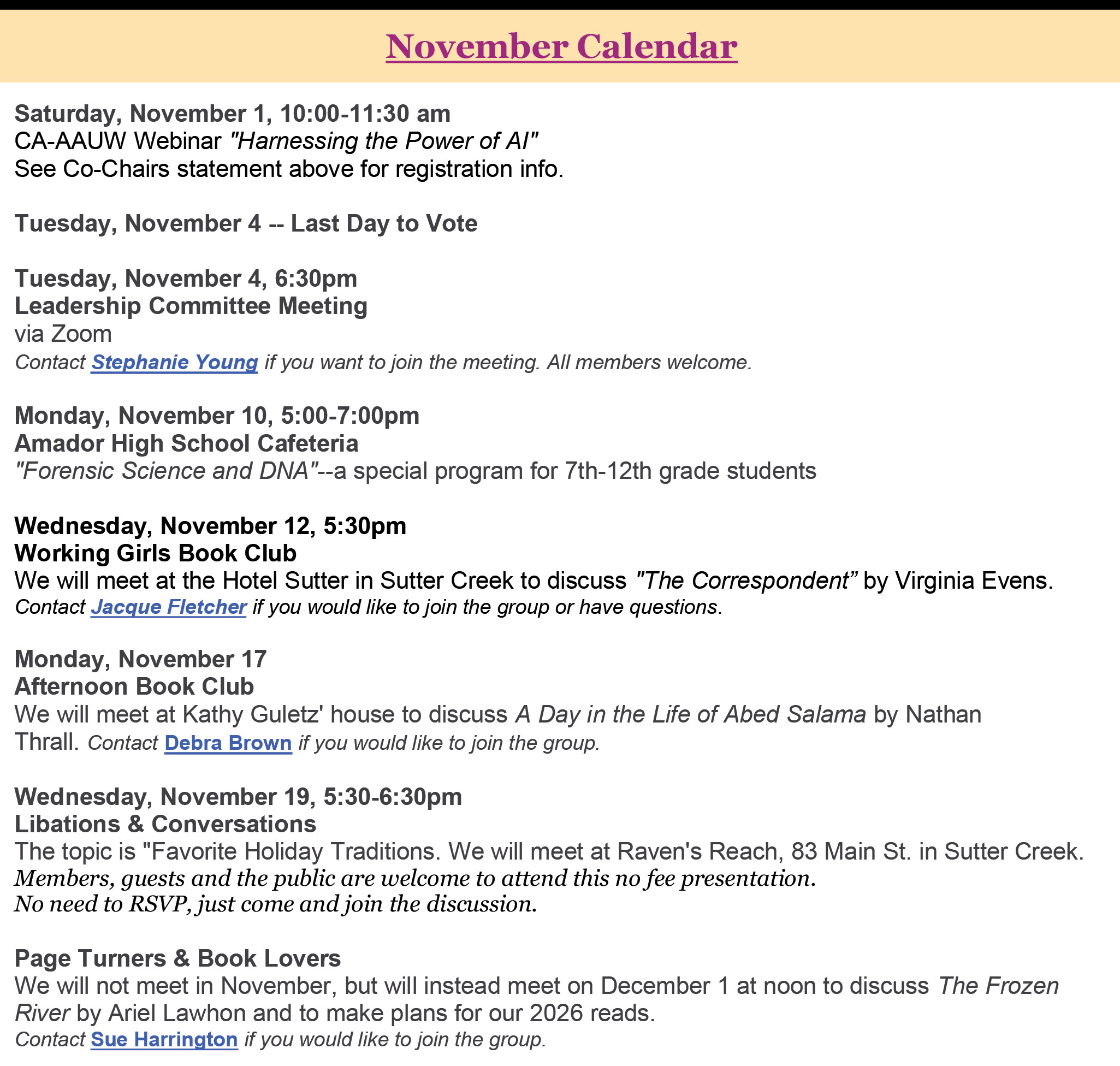 On October 26, the AAUW Amador Branch hosted an informative panel discussion with local women leaders at Amador High School. The panel’s advice for those interested in public service is as follows, 1) have a passion for problem solving and your community, 2) enjoy helping people, 3) have a great deal of patience to see you through many obstacles, and 4) be a good listener. View the recording here: A Conversation with Women in Elected Office.